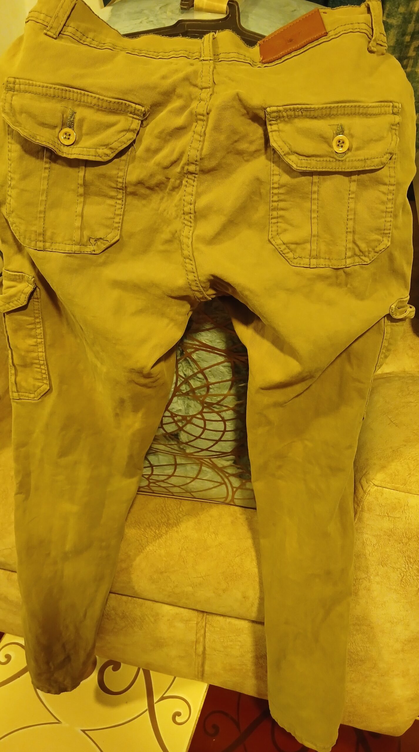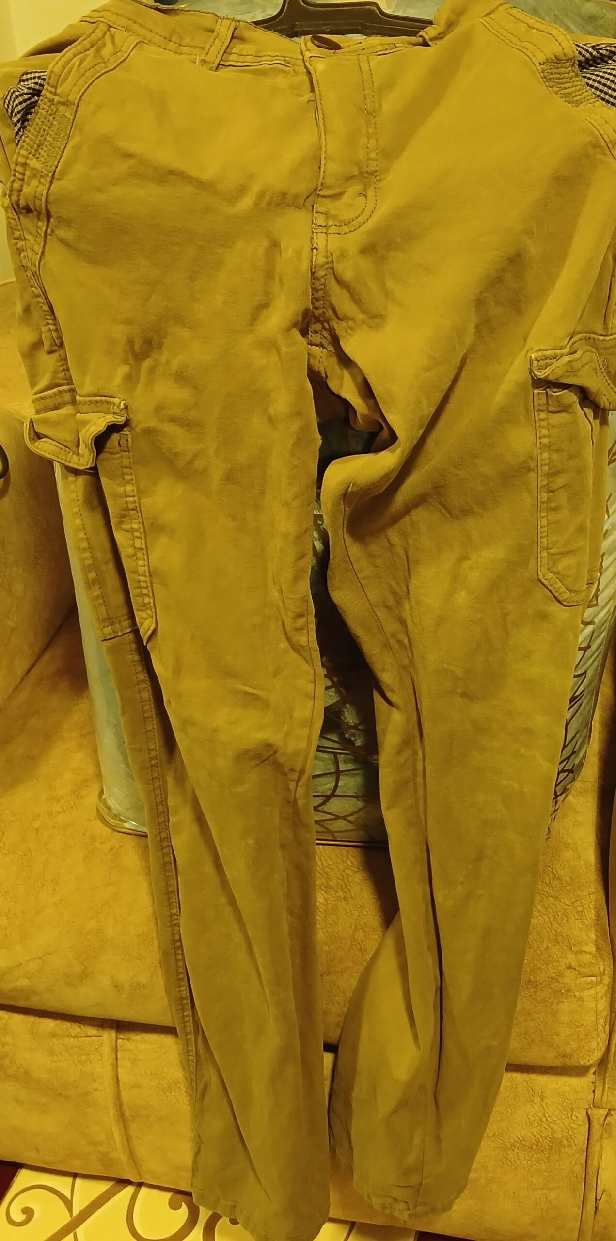 بنطلون چينز كاكى بجيوب أمامية وخلفية وبأزراز من الأمام مقاس ٣٢ بناتى وأولادى للشباب الصغير