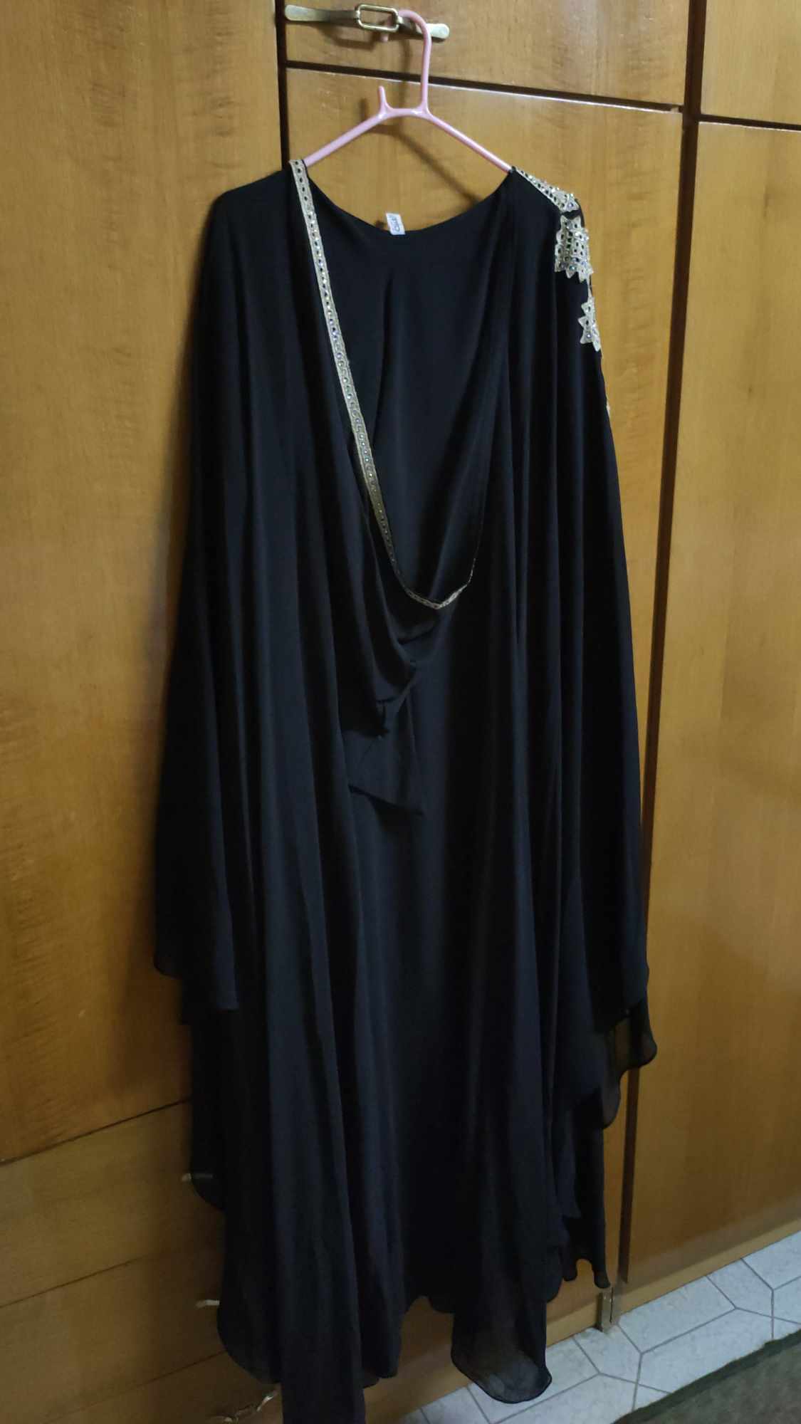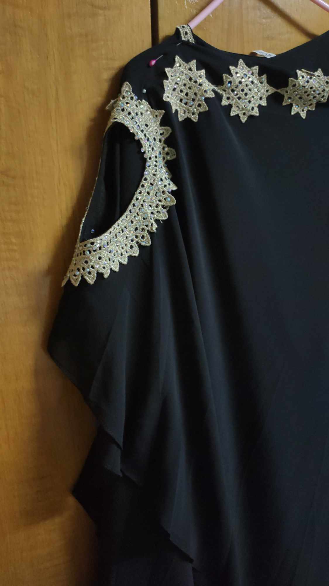 فستان عباية ماكسي اسود سواريه بصدر دهبي فاتح و أكمام واسعة ببييه دهبي شيفون و بطانة كريب مستورد مقاس ٤٨ يناسب من ٨٠-٨٨ كيلو